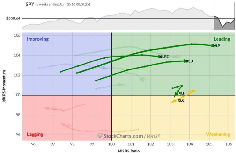• Consumer Staples and Utilities: Both reside within the weakening quadrant, but at high RS ratio levels. This combination, along with their strength on the weekly RRG, keeps them well inside the top five.